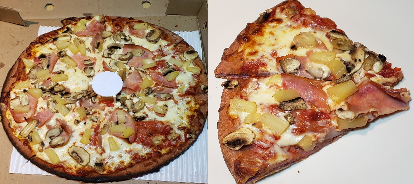 Ordering the pizza was easy, I did this via the website and paid the delivery man when they showed up. The food was luke-warm but it was a cold snowy day. The pizza cost about $18 Cdn (pre-tax) after selecting medium size, superfood crust, tomato sauce, mozzarella cheese, pineapples, ham and mushrooms.