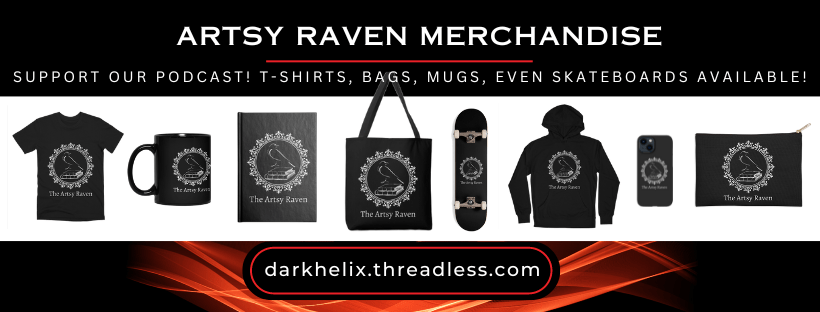 To support The Artsy Raven, please visit our Patreon page or send us some Ko-Fi! Time is money and it would be nice to be able to afford to pay my accountant as a writer/podcaster. Also remember to check out our Artsy Raven merch via Dark Helix Press’ Threadless store!