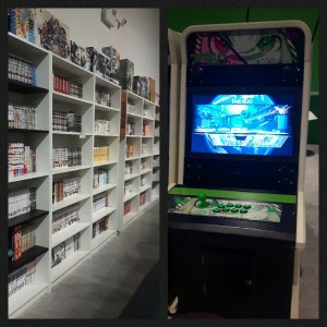 Here you can see walls of manga and the back room had rows of arcade machines and video game setups.